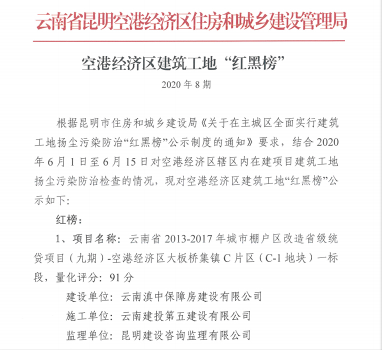 此次“紅黑榜”是昆明空港經(jīng)濟(jì)區(qū)住房和城鄉(xiāng)建設(shè)管理局根據(jù)昆明市住房和城鄉(xiāng)建設(shè)局《關(guān)于在主城區(qū)全面實(shí)行建筑工地?fù)P塵污染防治“紅黑榜”公示制度的通知》要求,對空港經(jīng)濟(jì)區(qū)轄區(qū)內(nèi)在建的80多個(gè)建筑工地進(jìn)行了揚(yáng)塵污染防治情況檢查后評出的結(jié)果。