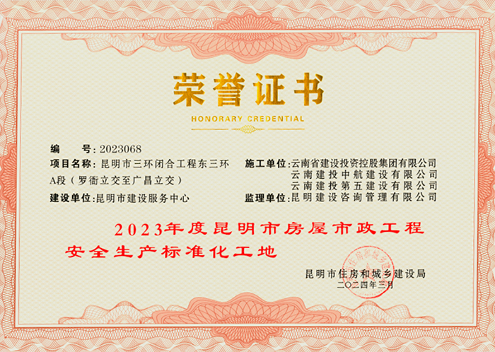 近日,由公司路橋一部承建的昆明市三環(huán)閉合工程?hào)|三環(huán)A段項(xiàng)目獲評(píng)昆明市住房和城鄉(xiāng)建設(shè)局“2023年度昆明市房屋市政工程質(zhì)量標(biāo)準(zhǔn)化示范項(xiàng)目”及“2023年度昆明市房屋市政工程安全生產(chǎn)標(biāo)準(zhǔn)化工地”。