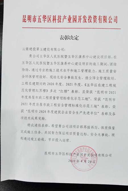 近日,公司收到昆明市五華區(qū)科技產(chǎn)業(yè)園開發(fā)投資有限公司的表彰文件,對第三直管部施工的五華區(qū)人民醫(yī)院暨五華區(qū)康養(yǎng)中心建設項目表示肯定。文件中指出,五華區(qū)人民醫(yī)院項目在施工期間,通過專業(yè)的施工技術水平和施工管理能力,使得工程的質(zhì)量較好,施工現(xiàn)場的安全環(huán)保管理情況較好、現(xiàn)場無安全事故發(fā)生、揚塵降塵效果較好,在2020年度、2021年度榮獲多項表彰,希望項目部再接再厲,保質(zhì)保量完成施工任務。 五華區(qū)人民醫(yī)院…