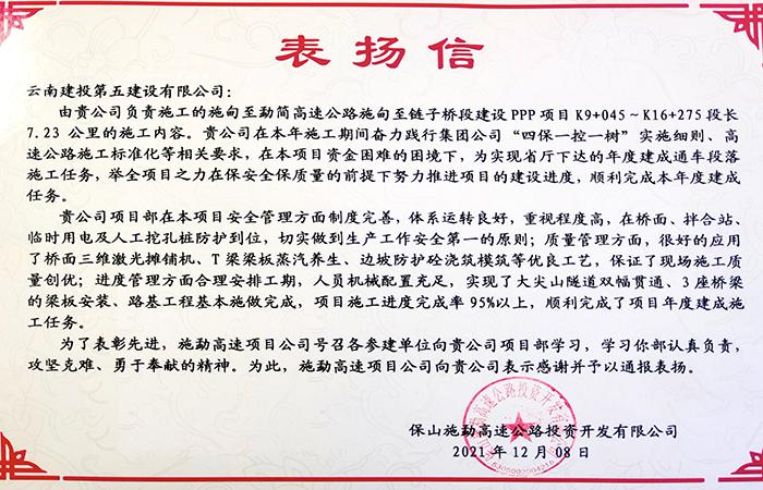 近期,施鏈高速二分部在施工期間連獲總承包二部“先進(jìn)單位 流動紅旗”;施甸縣姚關(guān)鎮(zhèn)山邑村民委員會贈“搭建民心工程 接通天長地久”錦旗;收到業(yè)主單位保山施勐高速公路投資開發(fā)有限公司《表揚信》等3個獎勵,項目工作得到了上級單位、地方單位的充分肯定。當(dāng)前,施鏈高速二分部已進(jìn)入后期施工階段,在施工進(jìn)度方面大尖山隧道已貫通,達(dá)到移交驗收條件;路基工程的挖方、填方、擋土墻、邊坡防護(hù)、涵洞、平臺截水溝均已完成,水…