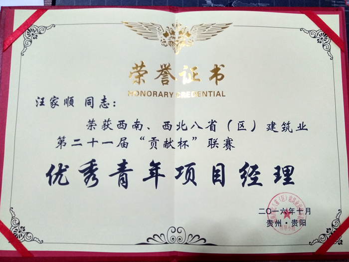 在聯(lián)賽中,來自公司五〇五直管項目部的汪家順同志被評為本次聯(lián)賽的“優(yōu)秀青年項目經(jīng)理”。汪家順于2004年7月畢業(yè)參加工作,先后經(jīng)歷了10個項目,現(xiàn)擔(dān)任公司五〇五直管項目部副經(jīng)理、大理滿江怡景尚居二標段項目經(jīng)理。汪家順在工作的12余年間,積極進取、勤奮好學(xué)、認真工作,收獲了公司多項榮譽。